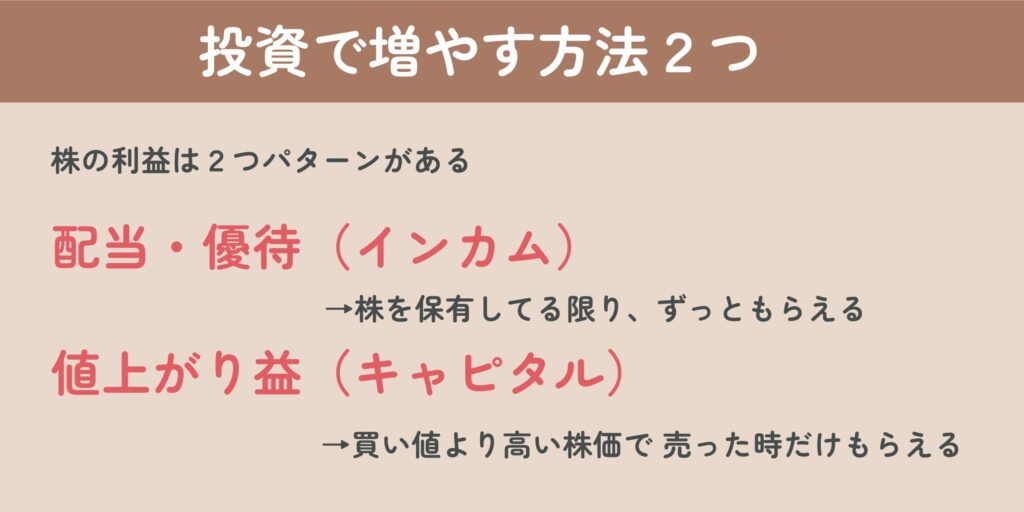 投資で増やす方法は、「値上がり益」と「配当金」の2つがあるんだよね☺