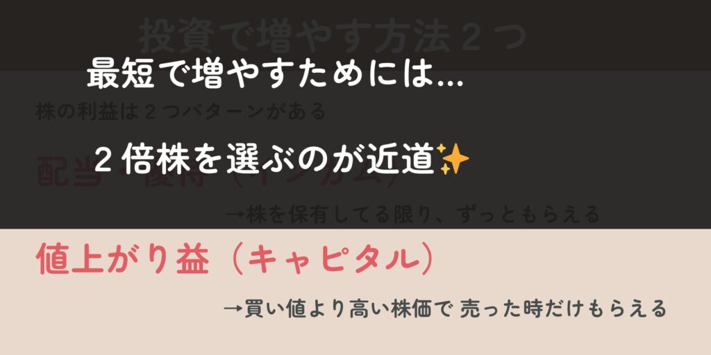 配当→じわじわ増えていく、値上がり→1年以内に倍以上に増える株も✨